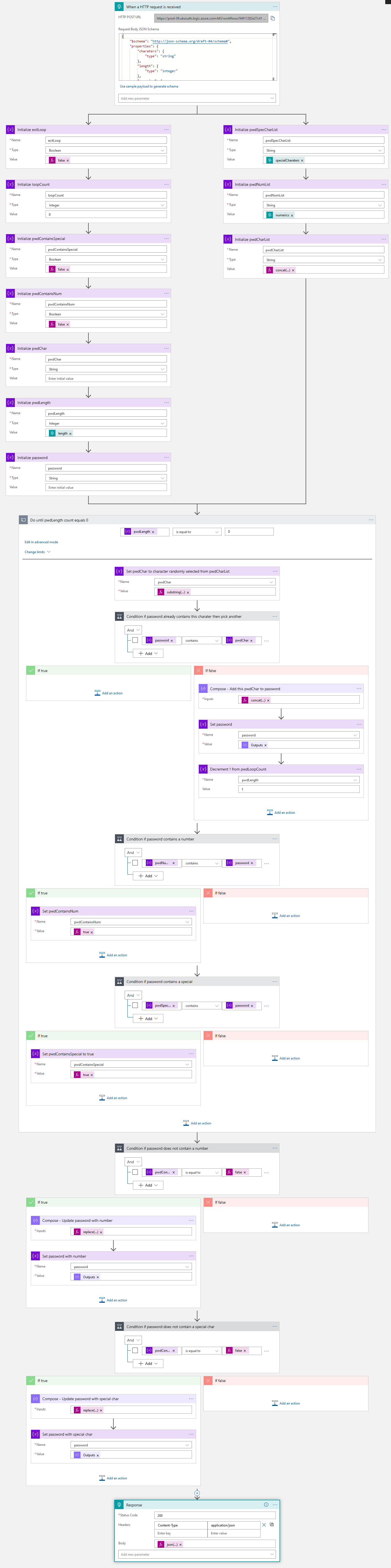 Another prerequisite workflow that I created was one that generates a random password for a new user. At first I did wonder why generating a password wasn’t a standard action step, but I probably should have used the Azure Key Vault (something for a future post). For the password workflow I include a screenshot of the entire workflow and if anyone wants further details then please leave a message.